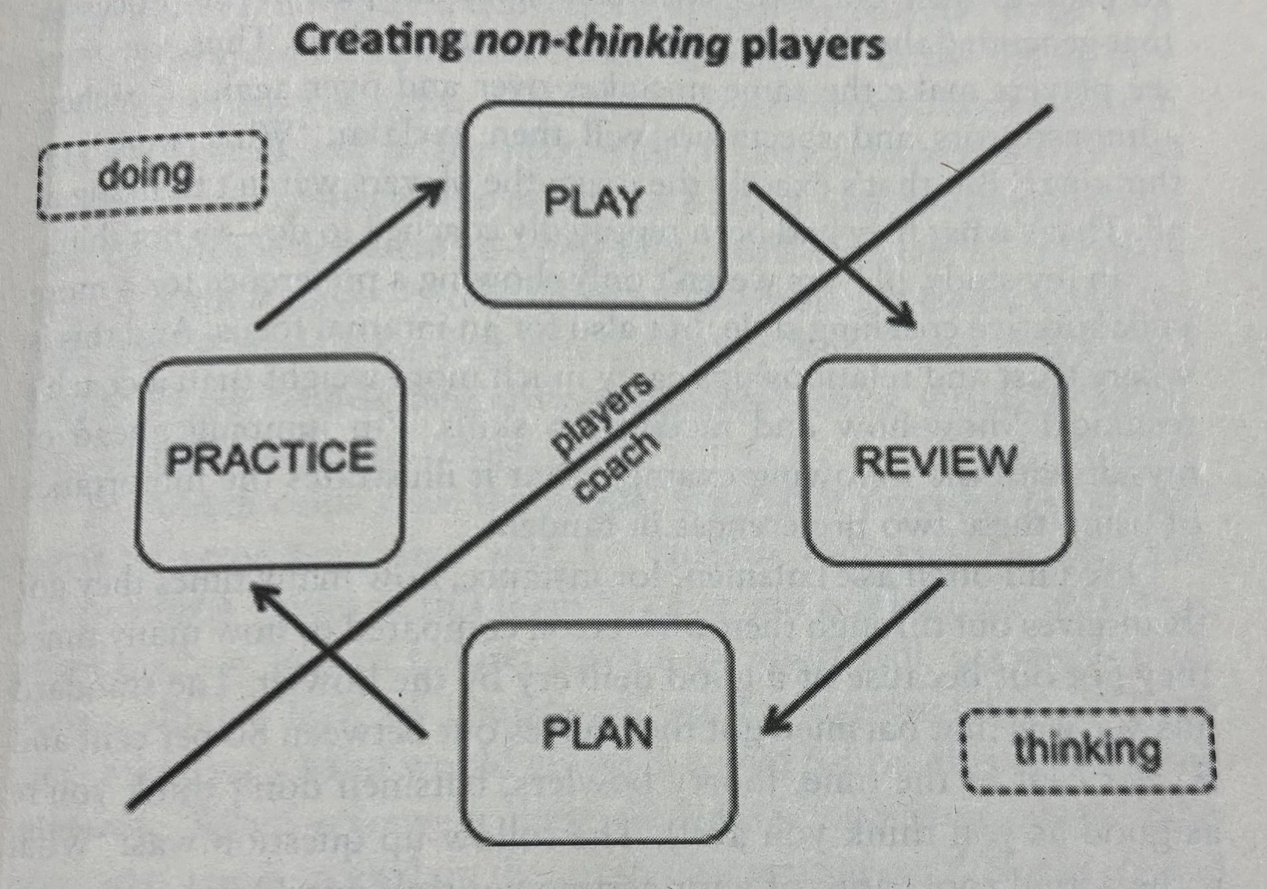 Mentioned in Upton's thesis on 'In order to have "thinking players" who can make in the moment/ on the field decisions and adjust their game plans, players, would have to be actively involved in the reflection, analysis and planning and not have it simply imposed on them by the coach.'